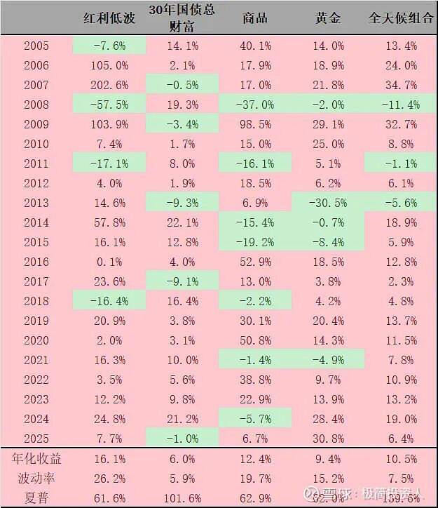经过一些数学模型和数据的验证,最终确定配置比例为20%股票+15%黄金+15%商品+50%长期债,长期配置这个资产能够获得一个年化10%收益的组合,组合在每年收益也是均为均衡,即便是红利低波这个股票在2008年金融危机中下跌也在-57%,但是全天候组合最差情况也只有-11%