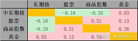 当然,不仅仅是股票和黄金、债券和商品相关性较低,通过数据统计,四个资产之间的相关性都较低,这就是投资讲的反脆弱,也叫东方不亮西方亮。